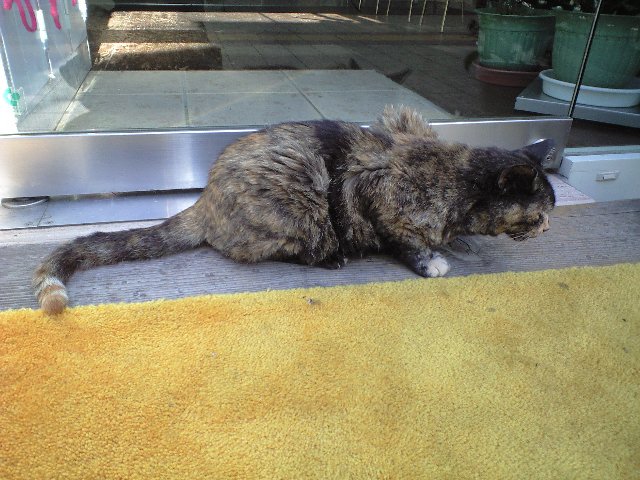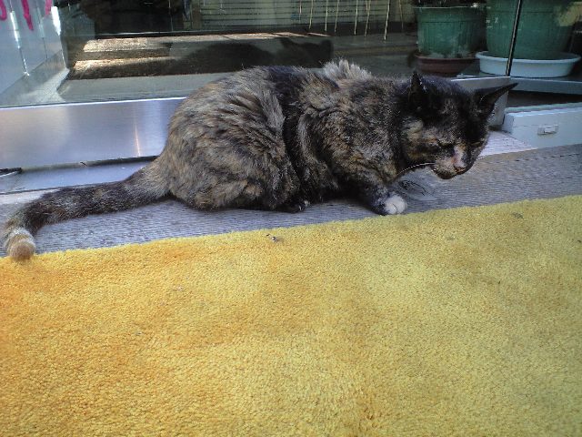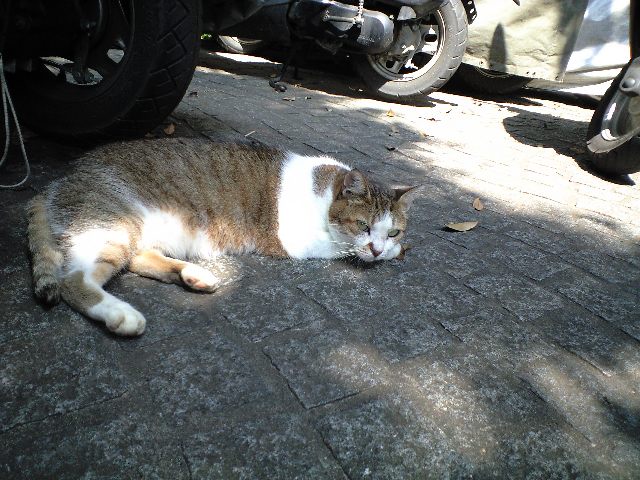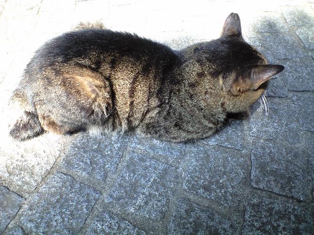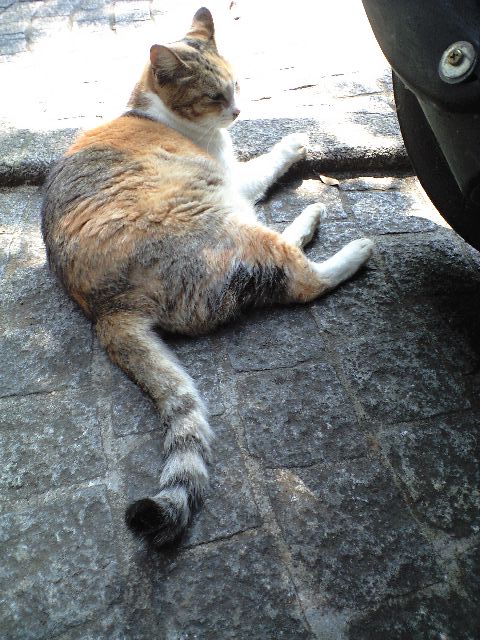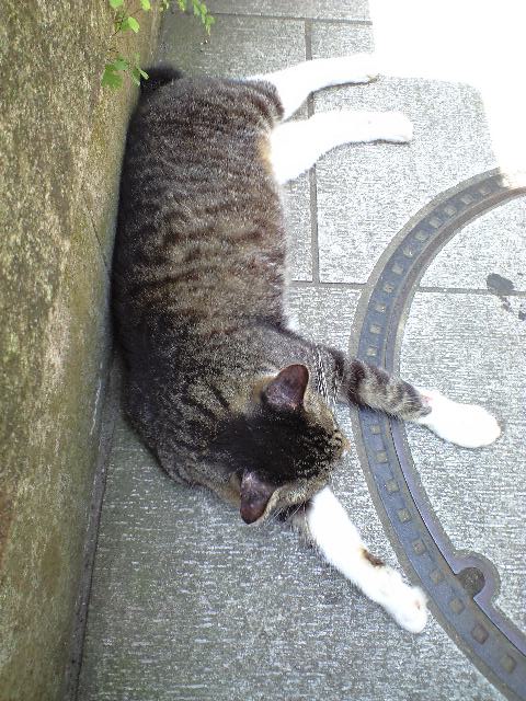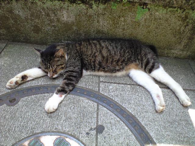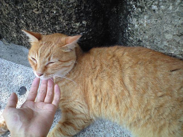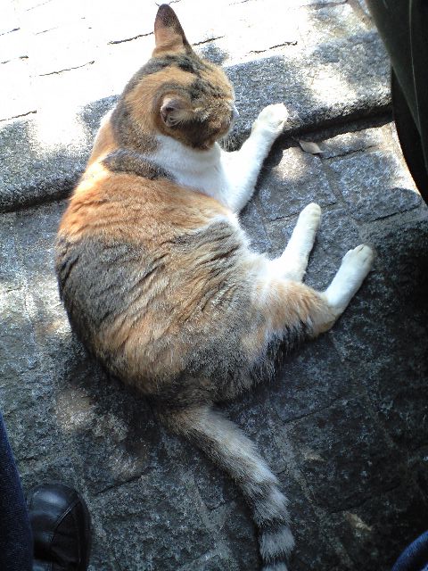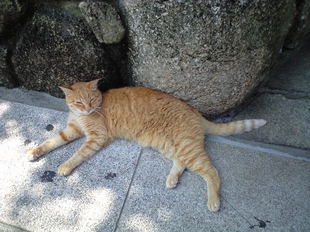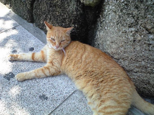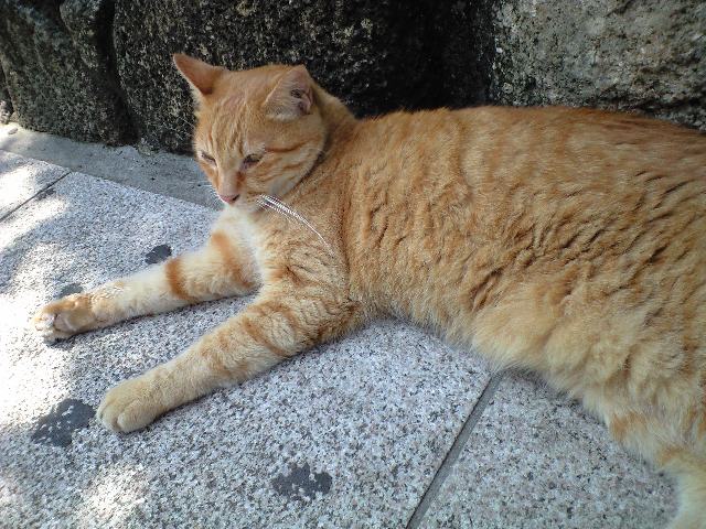 残暑でも観光客に愛想を振りまいてくれる稀有な猫。