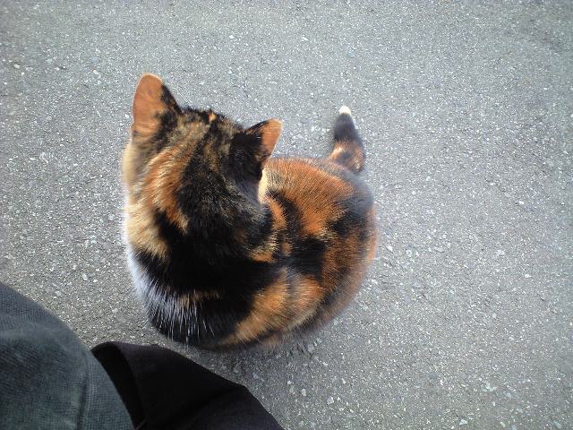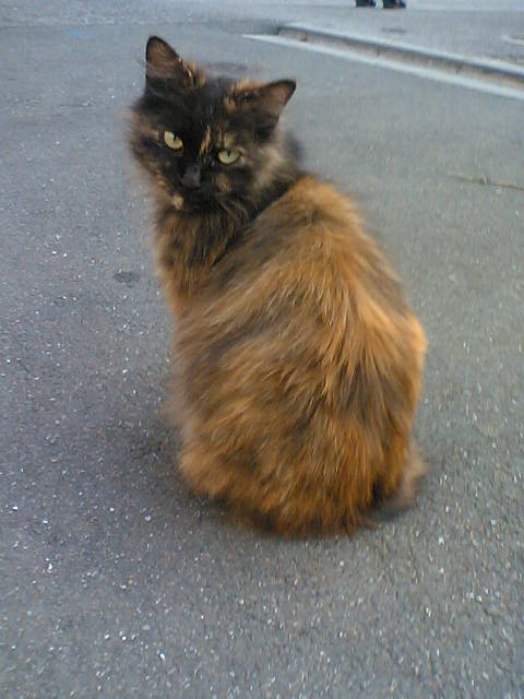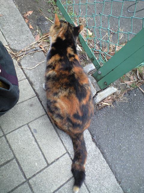 微妙に奇妙な曲がり加減の尻尾を持つ三毛猫。